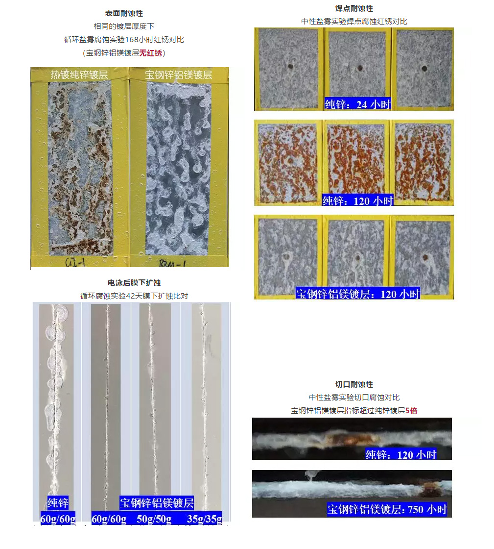 鋅鋁鎂優(yōu)異的耐蝕性體現(xiàn)在如下幾個(gè)方面:平面耐蝕性;切口耐蝕性;焊點(diǎn)耐蝕性;電泳后膜下擴(kuò)蝕