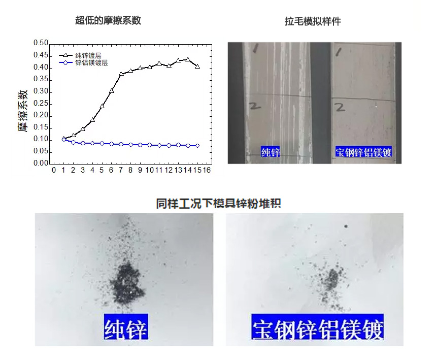 除此之外,寶鋼鋅鋁鎂鍍層還有具有優(yōu)異的成形性能,更適合汽車零件加工,如:摩擦系數(shù)低、鍍層磨損少、拉毛缺陷輕等優(yōu)點(diǎn)。我們還是拿數(shù)據(jù)說話: