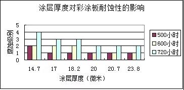 從微觀上講、涂層是多空的組織??諝庵械乃⒏g介質(氯離子等)就會通過涂層的薄弱部分侵入,造成膜下腐蝕,進而涂層起泡并剝落。另外,即使同樣涂層厚度,二次涂層要比一次涂層致密。根據國外報道和相關腐蝕試驗結果,正面涂層20μm以上才能有效的防止腐蝕介質的侵入,由于底漆和面漆的防腐蝕機理不同,不僅要規定總膜厚,還有分別要求底漆(》5μm)和面漆(》15μm)的厚度,只有這樣,才能保證彩涂鋼板不同部位的耐蝕性是均衡的。